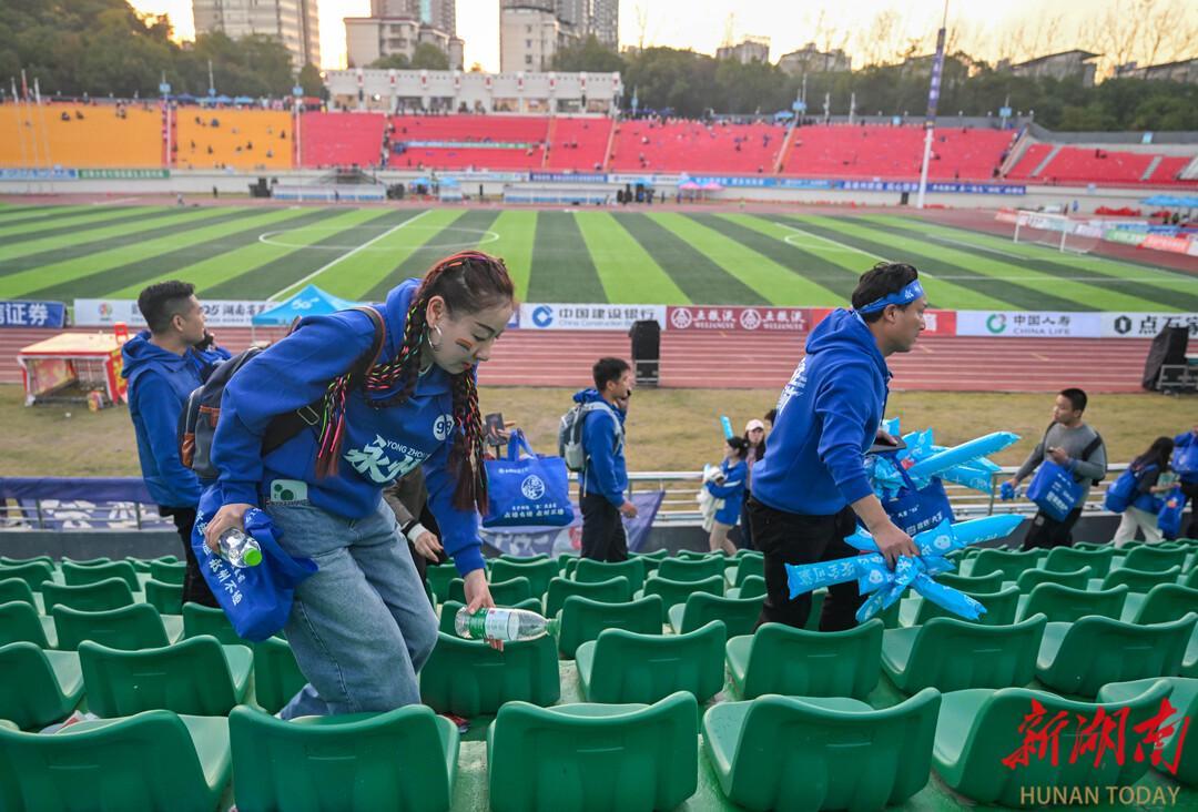 2025年11月29日,永州市体育场,球迷们在比赛结束后自发捡拾垃圾并带走的行为成为一道独特的文明风景线。湖南日报全媒体记者 郭立亮 摄